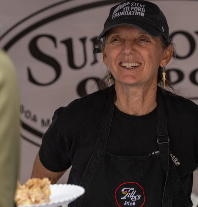 Trudi Rebsamen, Tilly’s Pies owner, and Peter Stetina served slices of pie to raise funds for the Steve Tilford Foundation in the Sunflower tent at the 2022 Belgian Waffle Ride expo.